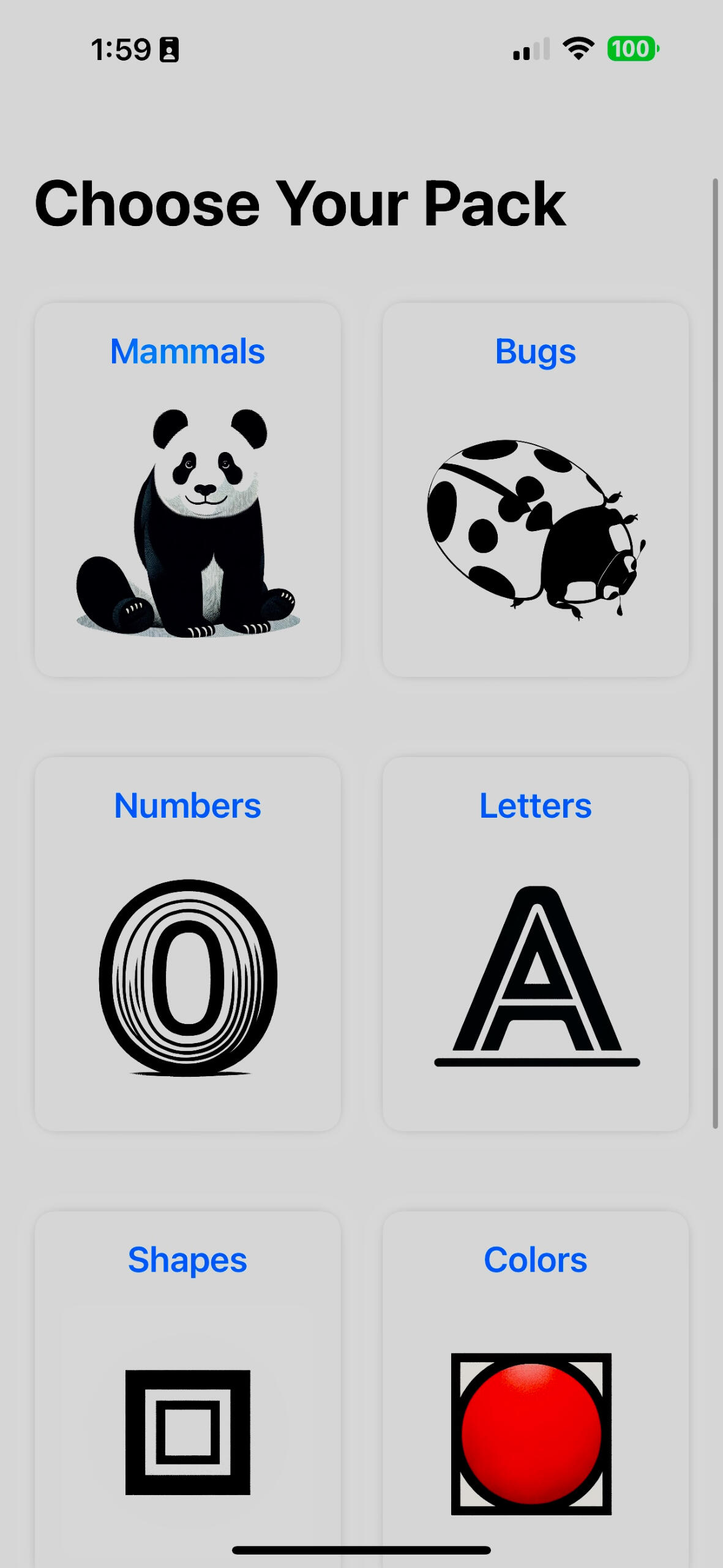 Choose from packs of numbers, letters, shapes, bugs, mammals, and colors